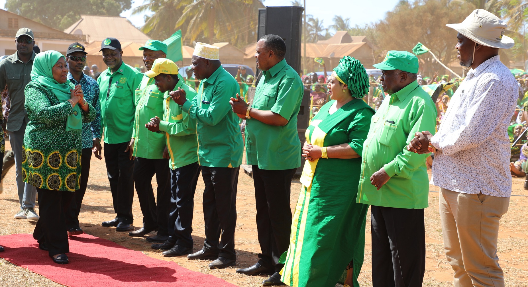 Mgombea Mwenza wa Kiti cha Urais wa Jamhuri ya Muungano wa Tanzania kwa tiketi ya CCM ambae pia ni Makamu wa Rais wa Jamhuri ya Muungano wa Tanzania Mhe. Samia Suluhu Hassan, akisalimiana na Viongozi na Wanachama wa Chama cha Mapinduzi na Wananchi wa Jimbo la Mtwara Mjini alipowasili katika Viwanja vya Sabasaba Mtwara Mjini kwa ajili ya kuhutubia Mkutano wa Kampeni za Chama cha Mapinduzi CCM leo Septemba 10,2020. Mkoani Mtwara.