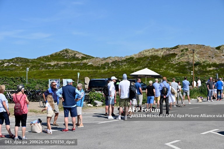 23 June 2020, Schleswig-Holstein, Sylt: Before the opening of the "Zanzibar" guests wait in a queue for the entrance. (to dpa "People are euphoric' - Holidays on Sylt in times of Corona")