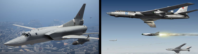 Range: 6,600 nmi practical range without in-flight refuelling, Mach 0.77 and carrying 6 × Kh-55SM dropped at mid- range and 5% fuel reserves
